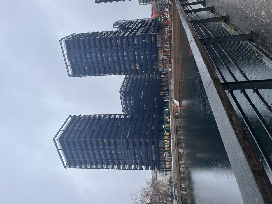 A canal runs alongside a pedestrian walkway with a metal railing. Three modern, high-rise buildings with a visible steel framework rise against a gray sky. Lights are visible in the buildings and along the lower floors near the water. Bare trees are visible at the base of the buildings. The scene appears overcast and possibly rainy.