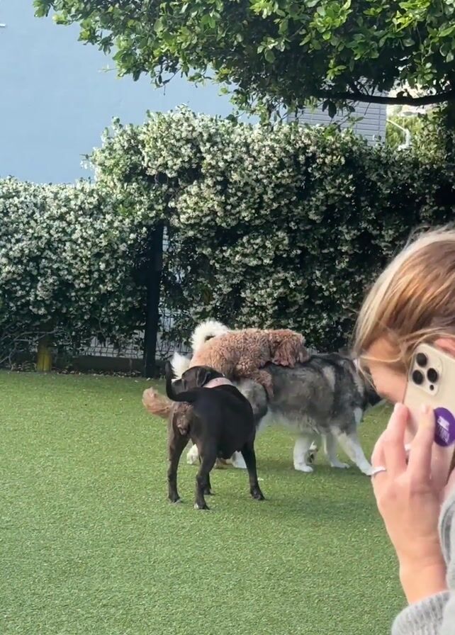 The video depicts three dogs interacting on a green, astroturfed area that appears to be a dog park. A woman in the foreground is on her phone, partially obscuring the scene. The dogs include a brown poodle mix that is positioned on the back of a gray husky. A smaller, black dog stands nearby, observing. Behind the dogs, three people are sitting on a low wall, watching the dogs. The background consists of lush green shrubbery, trees, and a light blue building with a visible window.