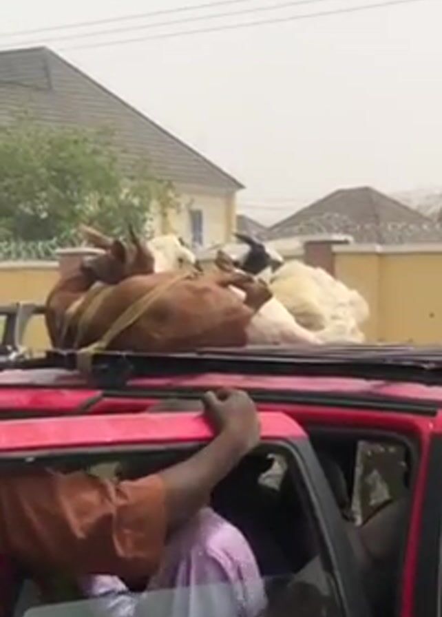 red car with multiple goats tied down on its roof rack. The goats are a mix of brown, white, and black. At least two people are visible inside the car, one wearing a brown shirt and another in a purple shirt. Several other people are standing around the car. The background shows a residential area with houses, fences, and trees. The weather appears overcast. The camera focuses mainly on the goats on the car roof and the people nearby.