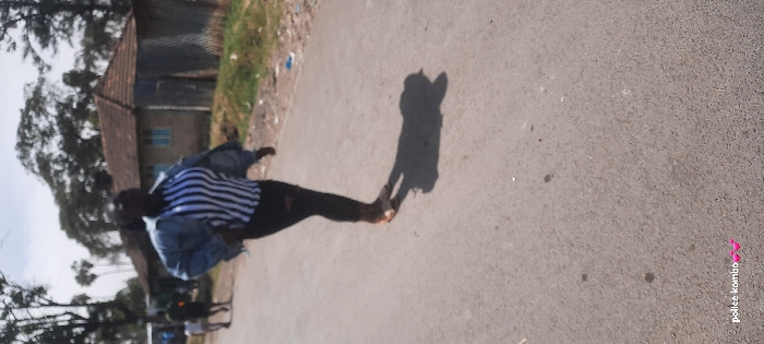 The image captures a sunlit street scene in Homa Bay, Kenya. In the mid-ground, a dark-skinned adult female is depicted in motion, walking leftward across a paved road. She is dressed in an unbuttoned light-blue denim jacket, a black and white vertically striped long-sleeved top, dark trousers (possibly jeans with a tear on the left thigh), and light-colored open-toed sandals. Her head is slightly turned towards the left of the frame. A prominent dark shadow of the subject is cast on the asphalt road surface to her right, indicating bright overhead sunlight. In the blurred background, on the left side of the road, two additional individuals, one appearing to be an adult and the other a child, are walking away from the camera. To the right of the background figures, a single-story building with a reddish-brown tiled roof and light blue window frames is visible, situated next to a structure clad in corrugated metal sheeting. Various trees with dense foliage are scattered along the horizon, under a light-colored sky. The road is asphalt, with some minor litter visible along the right curb. Overlaid on the bottom left corner of the image is white text stating "police kombo" followed by two pink heart emojis.