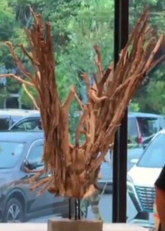 large piece of driftwood art on a stand in front of a large window. The driftwood is light brown, with numerous branches extending upwards. Outside the window are trees and several parked cars. A person wearing a black shirt, black pants with white stripes, and a face mask walks past the artwork. The room has a light brown floor and is well-lit.