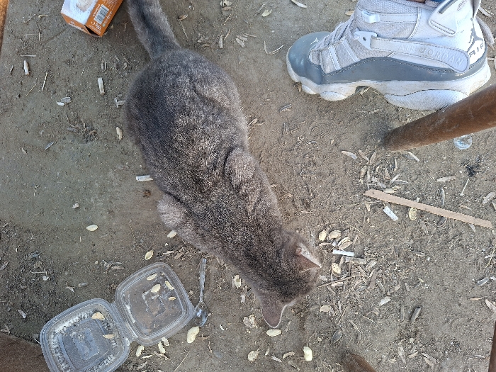 The scene is set at ground level outdoors in Moshtanets, Bulgaria. A grey tabby cat is positioned centrally, with its head lowered towards the dirt ground. Its body is elongated, facing towards the left side of the frame. A human foot, wearing a light-colored Air Jordan athletic shoe, is visible in the bottom right corner. The ground is dry, light brown soil, extensively covered with debris. This debris includes numerous elongated, light-colored husks (consistent with sunflower seed shells), multiple white cigarette filters, and small wood fragments. An open, clear plastic hinged container, holding similar husks, is located on the left. A clear plastic spoon lies near this container. A partially visible orange and white cardboard box is in the upper right. A dark brown, cylindrical object, resembling a furniture leg, extends diagonally from the bottom center.