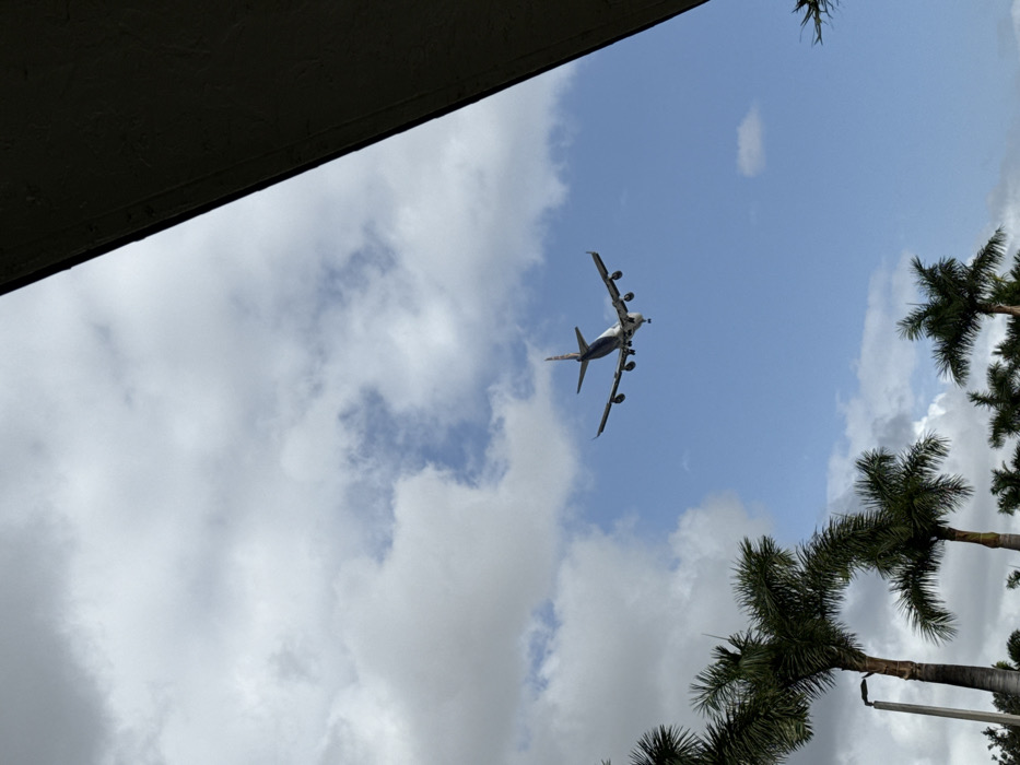 From a ground-level perspective, a passenger airplane is flying against a partly cloudy sky. The aircraft, featuring four engines mounted under its wings, is captured in mid-flight. Palm trees are visible on the right side of the frame, adding a tropical feel to the scene. The top left corner shows part of a dark building structure, indicating the vantage point is from within an urban setting.