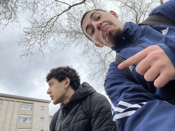 The image depicts two males outdoors under an overcast sky in an urban environment within Freiburg im Breisgau, Germany. The perspective is low-angle, capturing both individuals from below eye level. The male in the immediate foreground, positioned on the right, has dark hair, a mustache, and a goatee. He wears a dark blue Adidas track jacket with three white stripes on the sleeves and a black backpack over his right shoulder. His face is turned towards the camera, displaying a puckered lip expression. His right hand is raised, with the index finger extended and pointing leftward, generally in the direction of the second individual. The second male subject, positioned in the mid-ground on the left, is shown in profile. He has dark, curly hair and wears a black puffer jacket, with a black backpack strap visible over his left shoulder. His gaze is directed to the left, and his facial expression appears neutral. The background consists of bare deciduous tree branches against a uniformly light grey, overcast sky. To the far left, a multi-story building with a light-colored facade and multiple rectangular windows is partially visible. The architecture is consistent with urban residential or institutional buildings found in cities, but a specific street or district within Freiburg im Breisgau is not identifiable from the visual evidence.