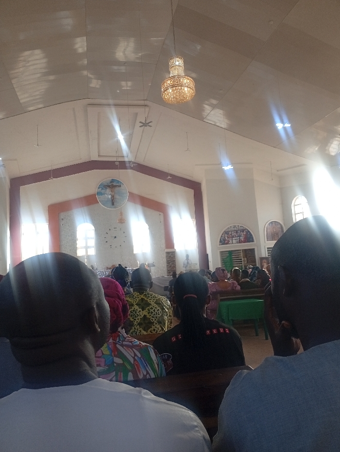 Inside a brightly lit church, a congregation sits in wooden pews