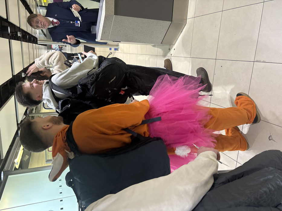 The scene depicts an interior area of Gatwick Airport in Crawley, United Kingdom, characterized by light-colored square floor tiles and modern, well-lit architecture including glass partitions and metal barriers. Four individuals are queued, facing a male airport staff member positioned behind a light grey service counter. The staff member, an older male with short grey hair and glasses, is wearing a dark blue suit jacket, a white shirt, and a red patterned tie with a lapel badge featuring the letter "G". He is gesturing with both hands while holding documents in his left hand, appearing to communicate with the queuing passengers. In the queue, from the staff member's perspective: 1. A male in the foreground, facing away from the camera, wears an orange full-body costume, complete with a bright pink tutu and a small white tail. He has short, dark hair and a beard. He carries a dark backpack, on top of which rests a light-colored slipper or shoe. 2. Behind him, another male, with short dark hair, wears a light grey hooded sweatshirt and dark trousers. He carries a black backpack branded "VOYDX" and "REDBULL." He is smiling and looking towards the staff member, holding a passport or boarding pass in his left hand. 3. Partially visible behind this individual is a person wearing a light-colored, textured garment. 4. The person closest to the camera is largely obscured, showing only a light-colored top garment and a dark backpack.