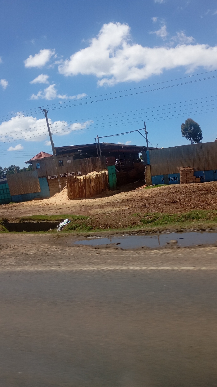 A roadside view features a timber business under a sunny, partly cloudy sky. The business, enclosed by corrugated metal, includes timber stacks. One section of the metal fence is painted with the words "DAMI AMBI TIMBER" and "WATA." Utility poles line the upper left. A dark asphalt road occupies the foreground, displaying a small puddle near the shoulder. A small area of vegetation appears adjacent to the road, situated between the road and the timber business.