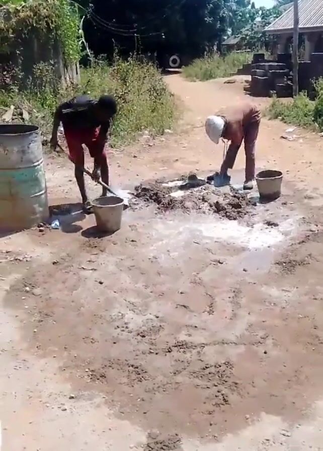 Two people mix cement using shovels in a rural area