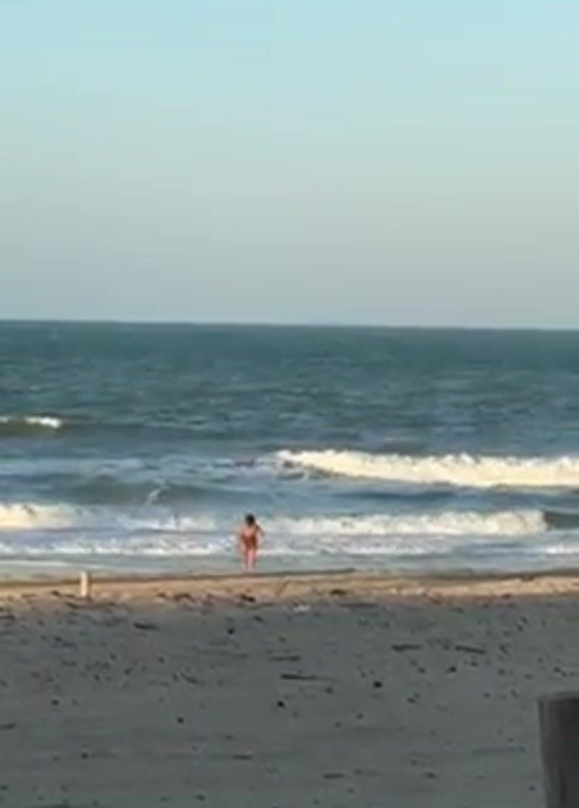 person in a bikini walking toward the ocean on a sandy beach. The ocean is a dark blue-green color with waves breaking near the shore. The sky is a clear, light blue color. There is a wooden post in the foreground on the right side of the frame.