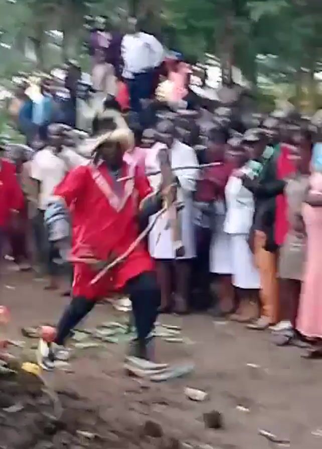 person in a red costume and a headdress made of white feathers performing a dance in front of a crowd of people. The person is holding wooden sticks and moving erratically. The crowd is watching the performance, and some people are recording it on their phones. The ground is dirt, and there are trees in the background. There is a flower arrangement in the foreground.