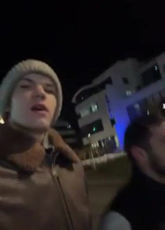 Two men stand outside in the dark. The man on the left is light-skinned, wearing a tan jacket, a light grey beanie, and a dark shirt, and he faces the camera. The man on the right is light-skinned with a dark beard, and he is wearing a black vest over a long-sleeved black shirt. A white building with lit windows is visible behind them. Both men smile and react to something.