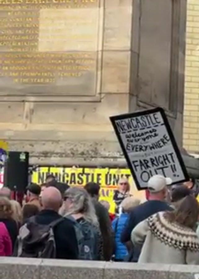 The scene shows a demonstration taking place in front of a monument. Many people are gathered, holding signs and banners. One sign reads, "Newcastle welcomes everyone everywhere but FAR RIGHT OUT!!" Some of the protesters are holding yellow and blue flags with the letters "PCS" on them. The monument has inscribed text on its surface. The background features a building under construction, partially covered in scaffolding. The mood appears to be one of activism and protest.
