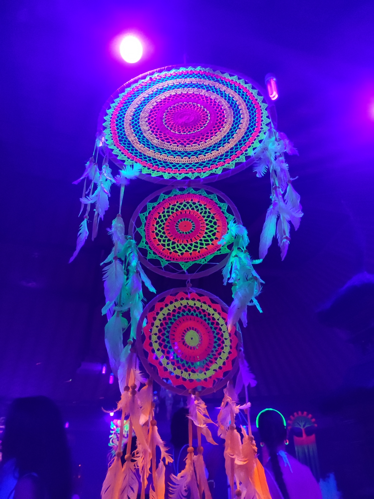 A vertical composition captured in Lokaserena, Indonesia, displays three luminous dreamcatchers suspended against a dark, ultraviolet-lit background
