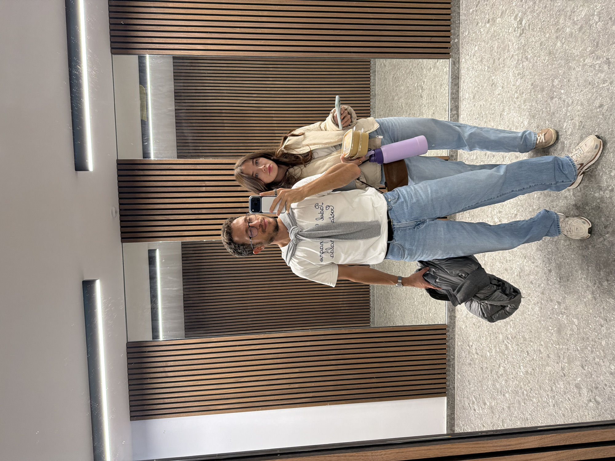 In the city of Livadia Larnakas, Cyprus, a man and a woman are taking a selfie in front of a wall with horizontal wood panels and a mirrored section. The man is holding a smartphone in his right hand, wearing glasses, a white T-shirt with writing, a grey sweater tied around his shoulders, light blue jeans, and white sneakers. He is also holding a folded grey jacket in his left hand. The woman is standing behind him, wearing a beige jacket, light blue jeans, and beige sneakers. She is holding a purple water bottle and a container in her hands. The floor is grey and speckled. The background shows reflections in the mirror, including the wall and the floor. The lighting appears to be bright and even.