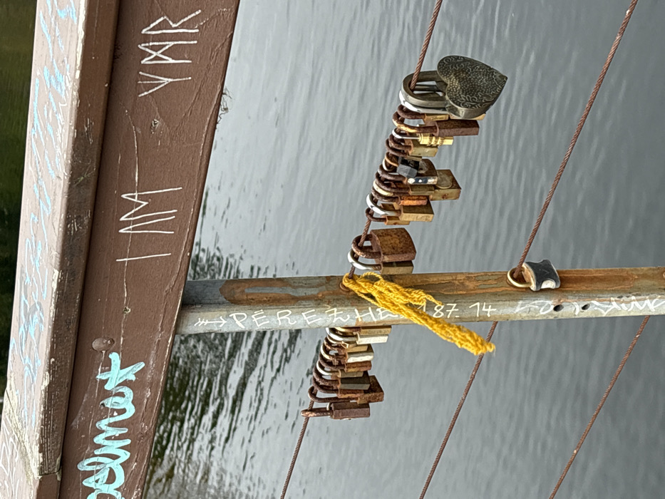 The image displays a close-up section of the Bryggebroen bridge railing in Copenhagen, Denmark. A weathered brown wooden handrail, marked with light blue and white graffiti including "oelmet," "I AM," and "YMR," sits above a rusted vertical metal post. This post bears white markings, partially decipherable as "PERE" and "187. 14." Two parallel steel cables are threaded through the post, supporting numerous padlocks. Approximately 25-30 corroded metal padlocks are secured to the upper cable, prominently featuring a large, ornate heart-shaped lock on the right. A single black and brass padlock is attached to the vertical post. A braided yellow cord is tied around the vertical post. Dark, rippled water is visible in the background below the railing.