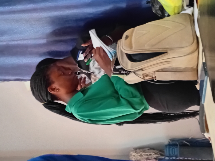 This image captures an indoor scene in Minna, Nigeria, focusing on two individuals and various objects within a confined space. In the foreground, a Black female, with long, dark braided hair styled in a ponytail, is actively writing. She wears a long-sleeved green collared shirt and black fitted trousers. She holds a white notebook in her left hand and a green pen in her right, directing her gaze downwards at the notebook. Behind her and slightly to the right, a Black male is partially visible, holding a smartphone in both hands and looking at its screen. He wears a dark top, possibly with a subtle stripe pattern on the visible shoulder area. On a surface in the immediate foreground, to the right of the female, rests a beige backpack with its top flap open. A light-colored smartphone is also visible lying flat on this surface. The background features a light-colored wall on the left, displaying stacked blue containers and hanging bundles of white fabric or cleaning materials. The right side of the background is dominated by a dark blue curtain. A black plastic bag and a yellow object are situated near the bottom right, adjacent to the curtain. The overall lighting suggests an indoor environment.