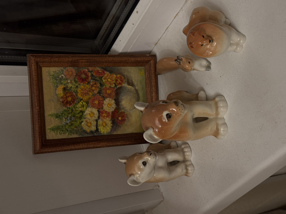 A static image displays a collection of decorative items positioned on a white, textured surface, likely a window sill or shelf, within an unspecified building in Zelenogradskiy, Russia. To the left, a light-colored wall is visible. To the right, a dark window frame and glass panel are present. The scene features four ceramic animal figurines and one framed painting. From left to right: 1. A ceramic figurine, resembling a tan and cream-colored lion cub or fawn, stands facing slightly right. 2. A second, similar ceramic figurine, also tan and cream-colored, stands slightly in front and to the right of the first, facing forward and slightly left. 3. Behind and between these figurines, a rectangular painting in a dark wooden frame stands vertically. The painting depicts a still life of a bouquet of colorful flowers, predominantly orange, red, and yellow, with green foliage, arranged in a grey vase against a light brown background. 4. To the right of the central lion cub figurine, a smaller ceramic figurine resembling a grey and tan squirrel stands upright. 5. Furthest to the right, a fourth ceramic figurine, resembling a tan and cream-colored lion cub or small dog, lies or sits facing left. This figurine appears to be a salt or pepper shaker, indicated by subtle features.