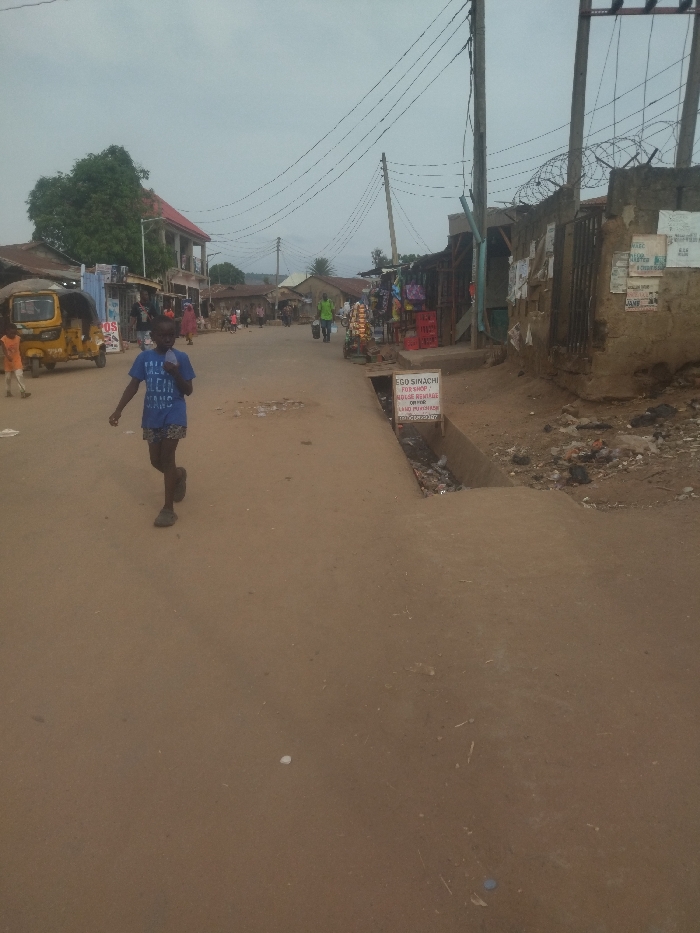 dirt road in Junction, Nigeria. A young boy wearing a blue shirt and black shorts walks along the road. There are several small shops and buildings lining the road, and there are many power lines overhead. The road is in poor condition and there is a drainage ditch on the side of the road, which is filled with trash. The sky is cloudy and the weather appears to be overcast. There are several people walking on the road in the distance, and some vehicles are parked on the side of the road. The buildings are made of brick and concrete. The road is dusty and uneven. The image was likely taken in the afternoon. The coordinates correspond to a location in the city of Junction, Nigeria. The scene is typical of many urban areas in Nigeria, showing the challenges of rapid urbanization and the need for infrastructure development.