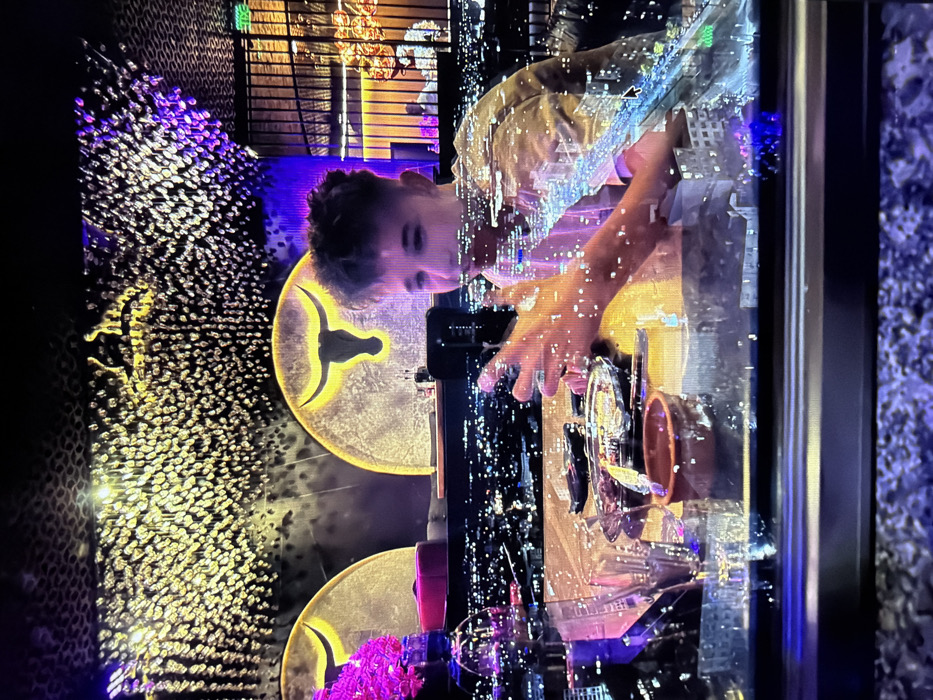 The image displays an indoor nighttime scene at The Prime Steak & Grill, situated on the top floor of Hotel Bulgaria in Burgas, Bulgaria. A young male, estimated to be between 12 and 16 years old, with short, dark, textured hair and wearing a light-colored t-shirt, occupies the foreground. He is seated at a dark, reflective table with his hands raised, mid-gesture. On the table, directly in front of him, is a round metal plate containing food, a small reddish-brown ceramic bowl, a clear drinking glass, and a tall clear bottle with purple-hued contents or reflections. The background features large windows overlooking the city of Burgas at night, with numerous city lights creating a panoramic vista that is partially reflected onto the table surface and the foreground subject. The restaurant's interior decor includes a ceiling adorned with a dense array of small, reflective, gold-toned elements. The walls are dark with subtle patterns. Two prominent, semi-circular illuminated panels are visible, each featuring a silhouetted bull's head with large horns, glowing with a yellow light. Purple ambient lighting is present in various sections. To the far right, partially obscured by vertical dark bars and warm wooden paneling, another individual is seated in the distance.