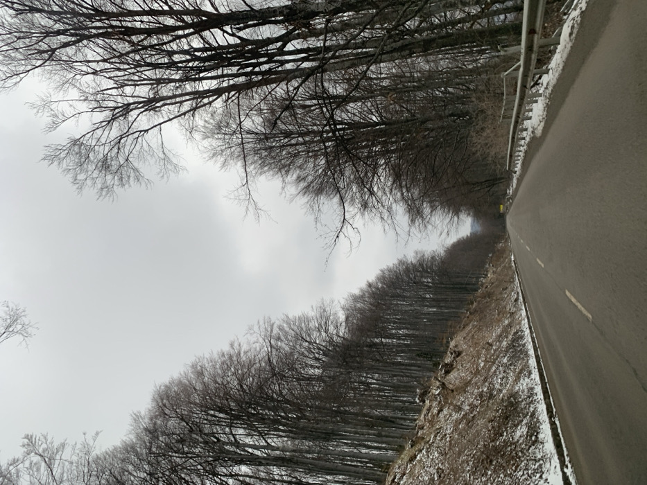 A two-lane asphalt road, marked with a solid white line on the left edge and a dashed white center line, extends into the distance under an overcast sky. The scene is located on a road near the city of Barziya, Bulgaria. To the left, a steep, snow-dusted earthen embankment rises, topped by a dense forest of tall, leafless deciduous trees. To the right, a metal guardrail parallels the road, with snow accumulation at its base, followed by a thick stand of similar bare trees. No individuals are present. No specific actions or interactions are depicted. The environment suggests a winter or late autumn season due to the bare trees and scattered snow. A faint yellow sign is visible in the far distance on the right side of the road.
