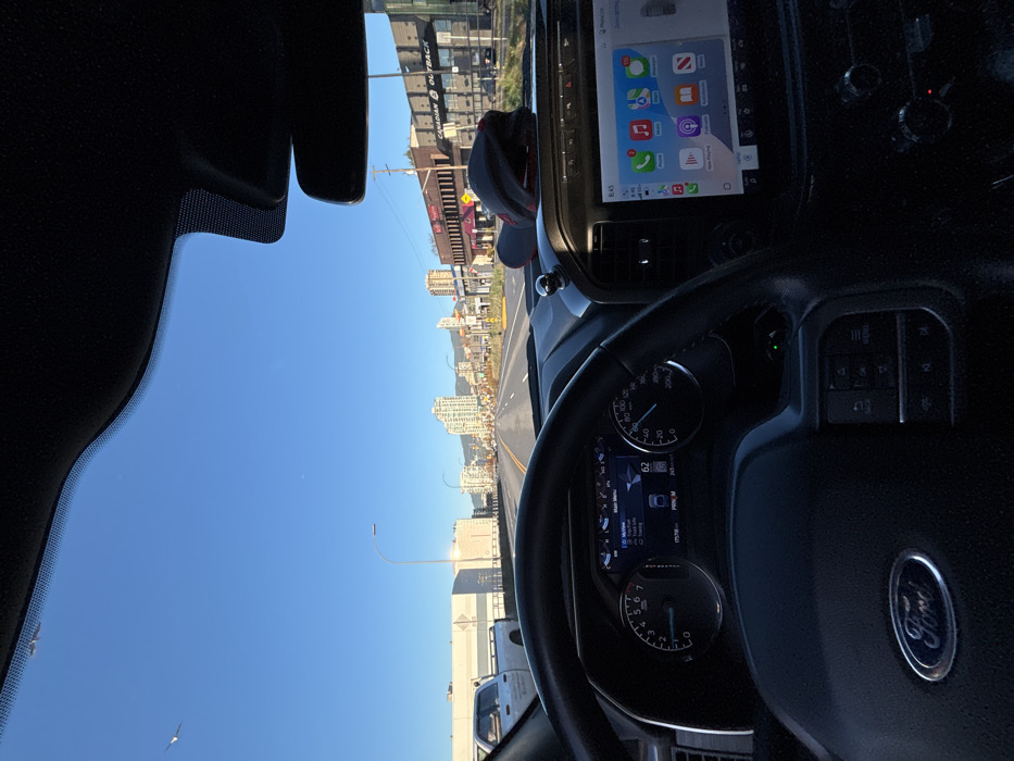 The view from a Ford truck's driver seat shows a sunny day on a city street with buildings in the distance