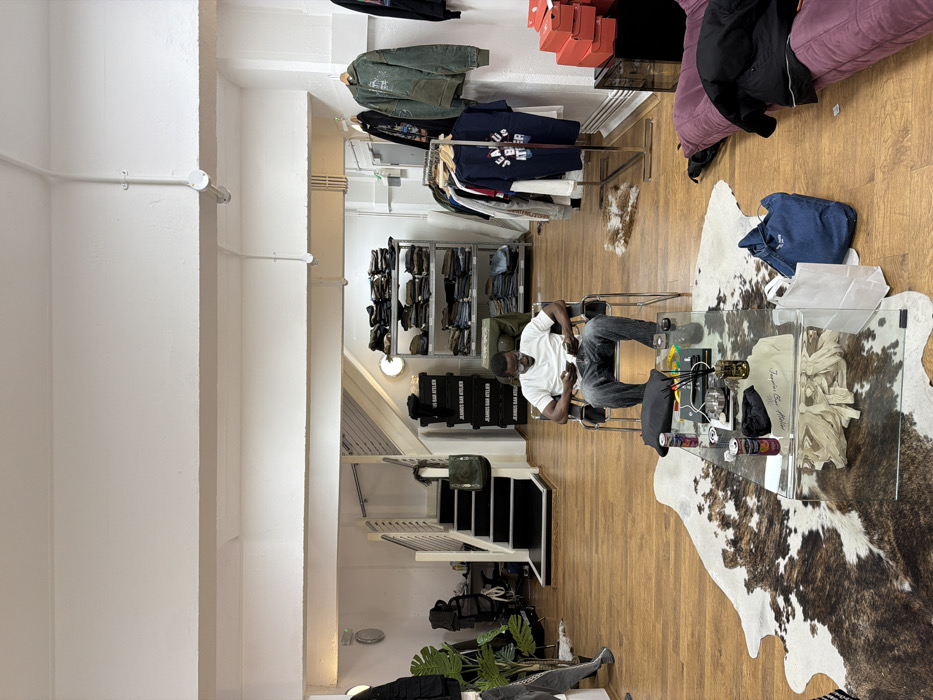 The image displays the interior of a clothing retail establishment, assumed to be located in London, United Kingdom. The space features a light wooden floor with a large brown and white faux cowhide rug centrally placed. The walls and ceiling are white, with visible electrical conduits running along the ceiling. In the foreground, a dark-skinned adult male is seated in a modern chair with a black metal frame and fabric sling seat. He is wearing a white short-sleeved t-shirt, dark jeans, and eyeglasses, and is actively engaged with a smartphone held in both hands. Directly in front of him, on the faux cowhide rug, is a clear glass coffee table. Items on the table include two beverage cans (one pink, one purple), a dark rectangular object, a reed diffuser, a light-colored garment with "Jeanus Bar Atelier" text, and a pile of beige fabric straps. To the right of the table, a purple floor cushion is visible, topped with a folded black jacket, a white paper shopping bag, and a blue denim tote bag. The midground and background present additional retail elements. On the left, a black-railed staircase with black treads and white risers ascends upwards. Adjacent to the staircase is a large artificial green plant. Three black storage boxes, each bearing the text "JEANUS BAR ATELIER," are stacked vertically in the midground. Behind these boxes, a metal shelving unit is laden with multiple folded pairs of jeans or trousers. To the right, a metal clothing rack displays various hanging garments, including a dark blue t-shirt with "JEANUS BAR ATELIER" branding. Further right, stacks of red shoeboxes, some featuring Nike branding, are visible on a dark surface. Circular wall-mounted light fixtures illuminate different sections of the store. The scene suggests an organized boutique environment.