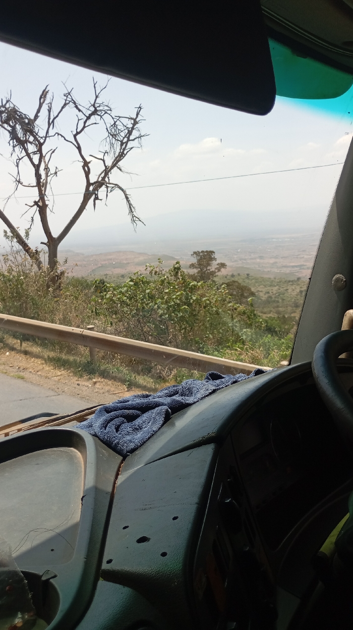 The image captures an exterior landscape view from inside a vehicle, specifically from the passenger side, looking forward and slightly downward. The scene depicts a dry, hilly, and expansive rural environment consistent with Lari/Kirenya ward, Kenya. In the immediate foreground, the dark green dashboard of the vehicle is visible, showing wear, including several circular indentations or holes on the right-hand side. A crumpled dark blue terry cloth towel rests on the dashboard near the center. The steering wheel is partially visible on the far right. Above, a dark sun visor is folded down, and the top portion of the windshield shows a blue-green tint. Through the windshield, a paved road curves from the lower left towards the mid-left. Parallel to the road, a metal guardrail, light brown or tan in color, runs across the mid-ground. Beyond the guardrail, dry, sparse vegetation and bushes cover an elevated embankment. A prominent, leafless, gnarled tree with dark branches stands on the left side of the embankment, silhouetted against the sky. The background reveals a vast, hazy valley or plain extending into the distance, characterized by brownish-green vegetation and irregular terrain. Faint indications of structures or settlements are discernible in the far distance. The sky is a pale blue with a few scattered white clouds, suggesting clear, sunny weather. The overall impression is a high vantage point overlooking a wide, semi-arid landscape under daylight conditions. No people are visible.