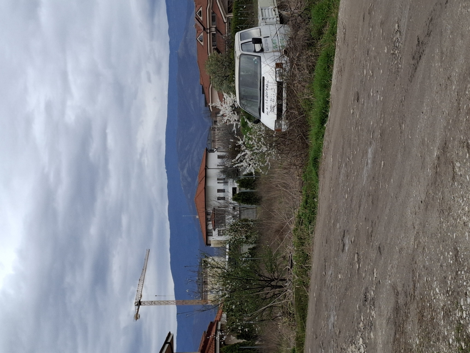 The image depicts an outdoor scene in Plovdiv, Bulgaria, featuring a partially obscured white van parked on the edge of a road. The road is unpaved and appears to be made of gravel. A mountain range rises in the background under a sky filled with clouds. A construction crane is also visible. Buildings with red tile roofs are scattered in the midground. The van has text written on its side and front. Vegetation including grass and bare branches are present.
