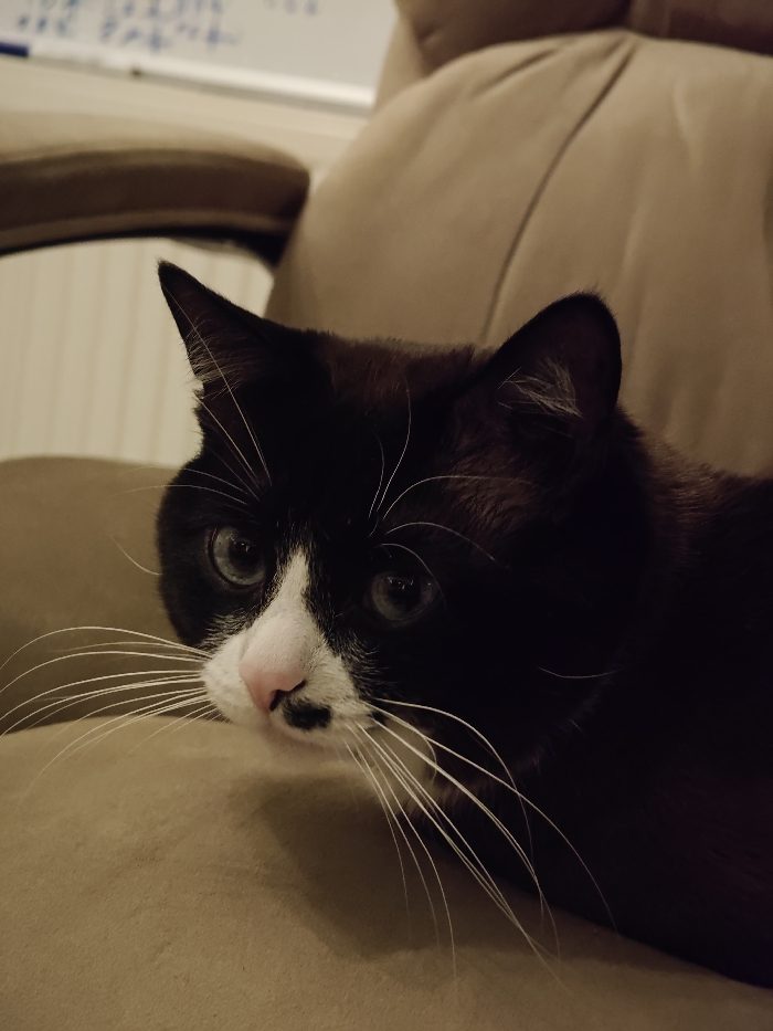 - "A tuxedo cat rests on a tan chair" by FM-eMutn2, licensed under CC BY 4.0