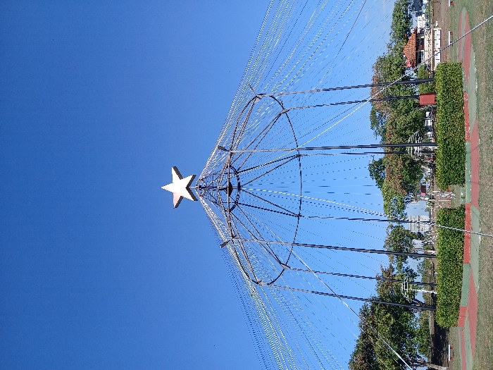 A unique Christmas tree stands tall, its frame constructed of metal. A prominent star sits at the top against a vibrant blue sky. Thin white strands create a conical shape, mimicking traditional tree branches. The base is surrounded by green bushes and grass, with hints of red and green painted surfaces nearby. The structure's supporting black metal beams reach toward the ground. Buildings and trees appear in the background, adding to the outdoor scene.