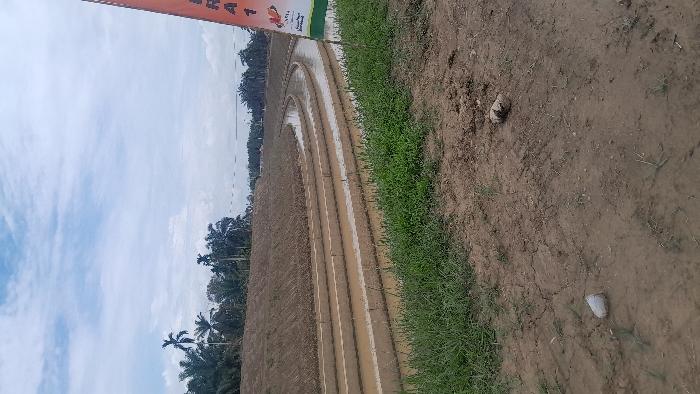 A landscape showcases a field with distinct parallel rows likely for agriculture, bordered by greenery. The soil appears moist or possibly flooded in the rows. Adjacent to the field, a patch of earth and grass transitions into a dirt path. Tall trees stand in the background beneath a partly cloudy sky. A banner or sign is present, partially visible in the upper left corner. The scene suggests a rural or agricultural area.