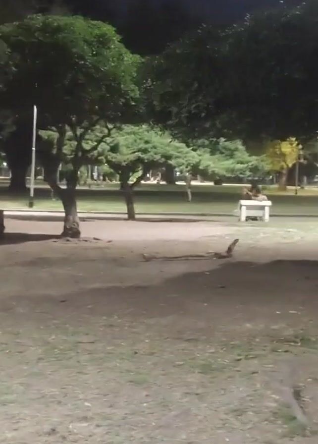 dimly lit park at night. In the background, there is a white concrete bench where two people are lying down. To the left of the bench, a woman is standing, and there are trees surrounding the area. In the foreground, a large, dried branch lies on the ground. The camera appears to be handheld, and the image is slightly shaky.