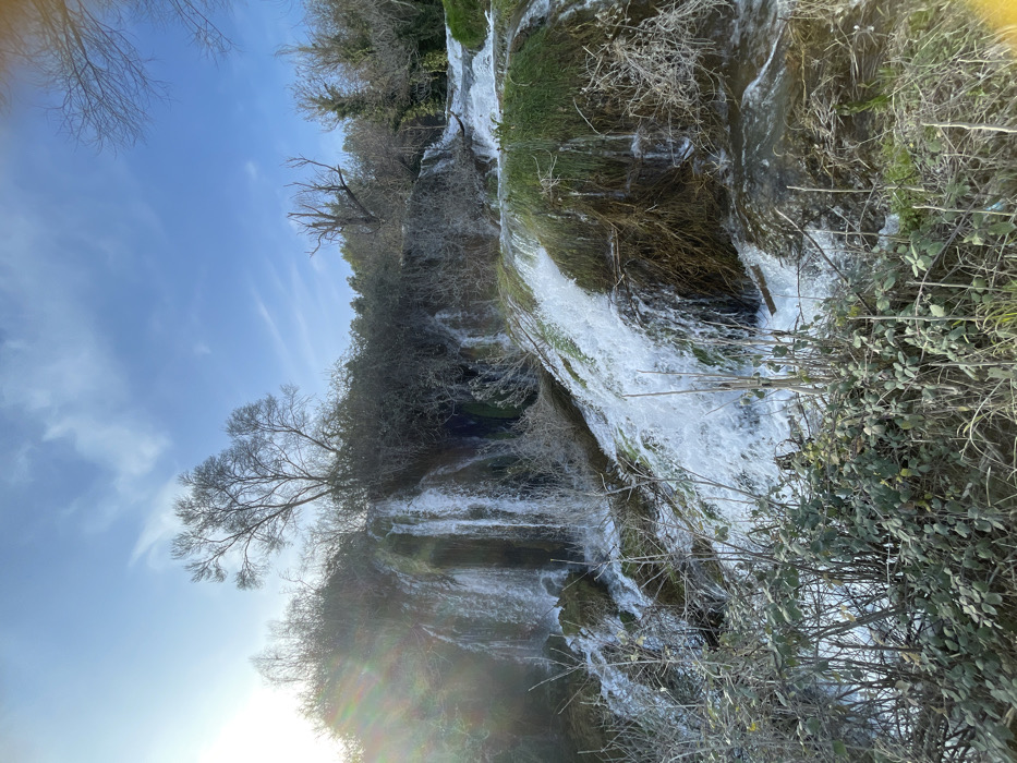 The image depicts a natural waterfall landscape in Zvirići, Bosnia and Herzegovina, under a clear blue sky with sparse white clouds. The sun is visible in the upper left quadrant, producing a prominent lens flare. Multiple cascades of water flow downwards from an elevated, densely vegetated rock formation across the middle and lower sections of the frame. The water is white and turbulent, indicating significant flow. The terrain consists of moss-covered rocks, green grasses, and various deciduous shrubs and trees, many appearing bare or with minimal foliage, suggesting a late autumn or winter season. No individuals are present.