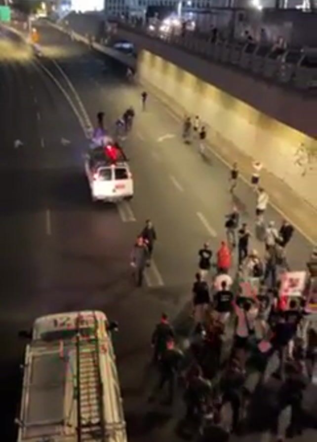 At night, an elevated perspective reveals a street scene featuring a gathering of people, primarily on the right side of the frame, adjacent to a barrier. Some individuals hold signs or banners. The crowd is monitored by several police officers wearing dark uniforms, some running toward the crowd. Two white police vans with flashing lights are visible, one parked near the foreground and the other further down the road. Traffic appears to be moving on the other side of the street. A building can be seen in the background. A loud, rhythmic sound can be heard.