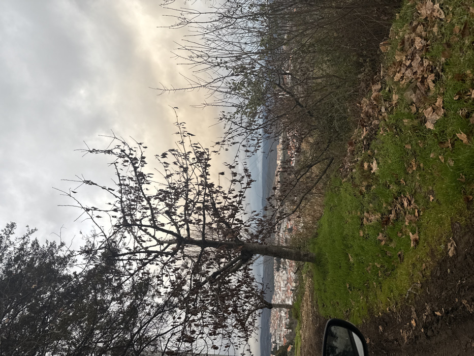 A landscape features bare trees against an overcast sky. A cluster of buildings is visible in the distance. Green grass and fallen leaves cover the nearby ground. The edge of a vehicle can be seen in the lower right corner. The image appears to be taken from an elevated position, possibly from a road or path.