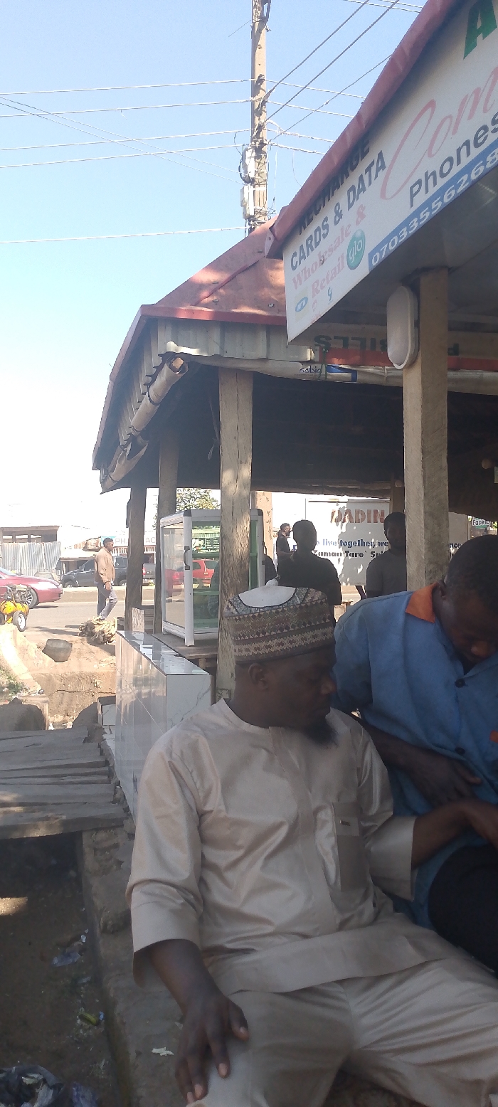 This image captures a street scene in Jos, Nigeria, under a clear blue sky. In the immediate foreground, a man wearing a light beige traditional kaftan-style garment and a patterned kufi cap with a beard is seated on the left, looking downwards or to his right. To his right, a second man, partially visible, wears a blue shirt with an orange collar and appears to be looking down. Below the seated men, a concrete drainage channel or culvert is visible, partially covered by wooden planks serving as a makeshift walkway, with some debris present in the channel. In the midground, behind the seated individuals, stands a roadside stall or structure with a red corrugated metal roof supported by wooden posts. A white sign attached to the front advertises "RECHARGE CARDS & DATA Wholesale & Retail Phones" with the phone number 07033556268 and logos for MTN and Glo. Behind this structure, several other individuals are visible, some standing. A white tiled counter or display unit is situated to the left of the main structure. Further in the background, a paved road is visible with several vehicles, including a red car, a dark sedan, and a red SUV. A man in a light brown shirt walks on the side of the road to the left of center. A yellow piece of equipment is near the red car. In the upper background, a utility pole with multiple electrical wires stands against the bright blue sky. A banner with partial text "ADIN" and "live together" is discernible on a distant building. The scene is brightly lit by natural sunlight.