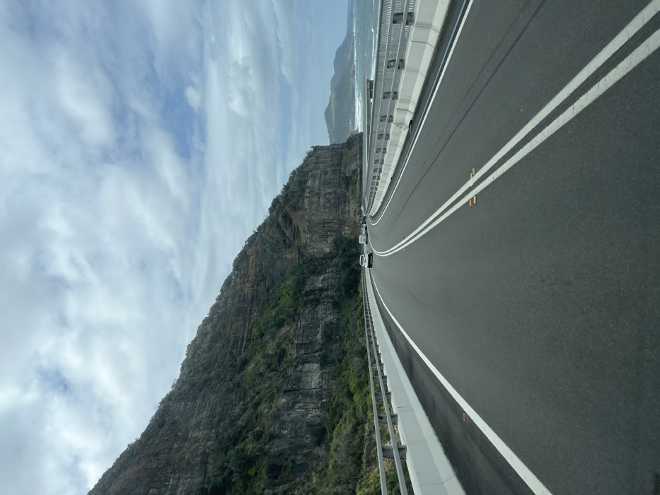 A curving elevated roadway with white lines parallels a steep, rocky cliff face covered with sparse vegetation. The road, seemingly a bridge, has cars traveling on it. In the distance, the ocean meets the horizon under a cloudy sky. The viewpoint is angled, presenting a skewed perspective of the scene.