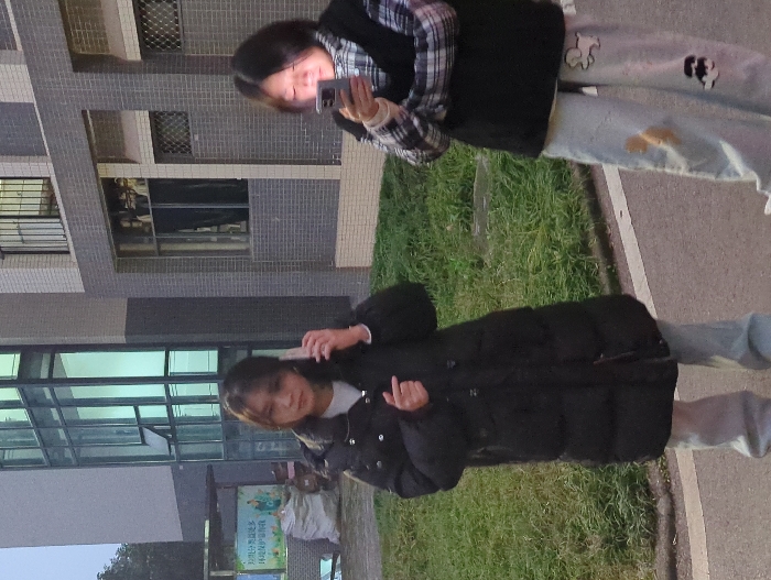 The scene depicts two young adult females standing on a paved outdoor pathway adjacent to a strip of grass. In the background, multi-story buildings with grey-tiled facades, barred windows, and modern glass sections are visible. A partially obscured green public service sign in Chinese characters, reading "垃圾分类从我做起 14亿人做护绿使者" (Garbage classification starts with me, 1.4 billion people become green guardians), is present on the left, confirming a Chinese urban location consistent with the city of Jiangjin. The female on the left wears a black, knee-length puffer coat over a light undershirt and light blue wide-leg jeans. She holds a light-colored smartphone to her left ear with her left hand, engaged in a phone call, while her right hand forms a small heart gesture with the thumb and index finger. Her dark hair is down. The female on the right wears a black puffer vest over a blue, white, and grey plaid long-sleeve shirt, paired with light-colored wide-leg jeans featuring distinct cartoon patches, including a brown-and-white dog-like figure on the right thigh. She holds a dark-colored smartphone with both hands, looking down at its brightly illuminated screen, which casts a glow onto her face. The ambient lighting is dim, suggesting either dawn or dusk. A white bag and other indistinct items are located on the ground to the far left. No direct interaction is observed between the two individuals.