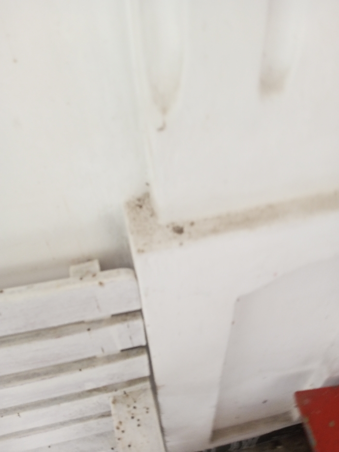 The image displays a close-up, angled view of soiled, predominantly white structural elements