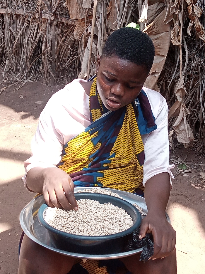In Okpatu-Ukehe, Nigeria, a young individual with dark skin and short dark hair is depicted outdoors, engaged in sorting seeds