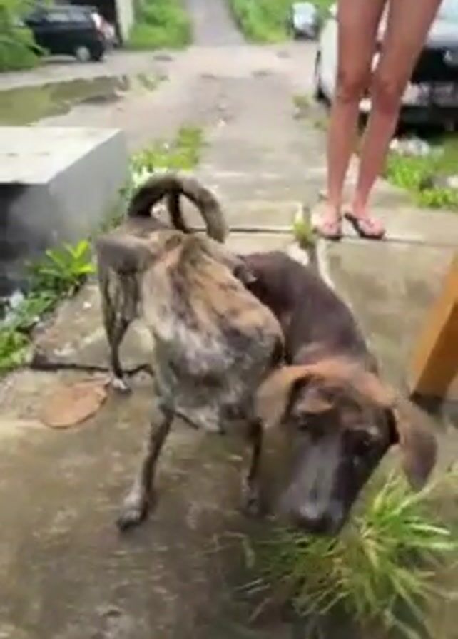 three dogs with patterned brown and black fur standing on a concrete surface. A person's hand reaches out to pet the dogs. A woman wearing shorts and sandals stands nearby. The background shows a narrow road leading uphill with cars parked on the side. Vegetation is visible on the sides of the road. The scene appears to be a driveway or yard area.