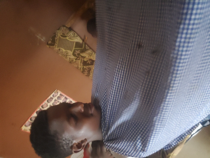 A person with short hair is seen from the side wearing a blue and white checkered shirt. The background is a blurry orange wall with a patterned pillow or fabric and a small photo collage. The image appears to be rotated.
