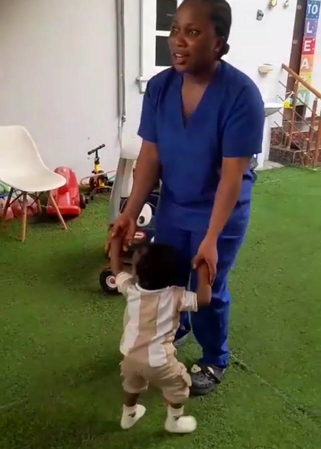 A woman in blue scrubs helps a toddler walk on artificial grass in an outdoor setting. The woman is dark-skinned, with her hair styled in braids. She stands, holding the child's hands, and smiles intermittently. The child is wearing a striped shirt, shorts, and white shoes. They appear to be taking small steps, learning to walk. The area is decorated like a playground or daycare with a white plastic chair, small toy cars, and a red rug. In the background, there is a white building with windows and a staircase. The sun appears to be shining, giving the scene a bright atmosphere.