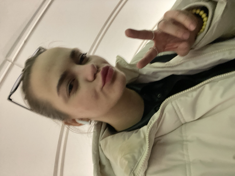 A young woman is seen from a low angle, looking down at the camera with pursed lips. She wears a cream-colored puffer jacket over a dark top. A yellow beaded bracelet is visible on her hand, which is raised in a peace sign. She has glasses perched on her head and an earbud in one ear. The background appears to be a plain ceiling.