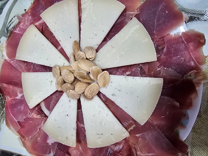 The image displays a close-up, overhead view of a food platter. The scene is static, devoid of people or direct actions. A round white plate holds a circular arrangement of thinly sliced cured ham, predominantly deep red and pink, forming an underlying layer. Eight triangular slices of light-colored cheese are radially arranged on top of the ham, pointing towards the center of the plate. At the very center, a cluster of shelled almonds is piled. The plate rests on a textured surface, possibly a patterned tablecloth or placemat, which is partially visible at the edges of the frame. No environmental details or identifying markers are present to determine a specific location within the city of Alicante/Alacant, Spain.