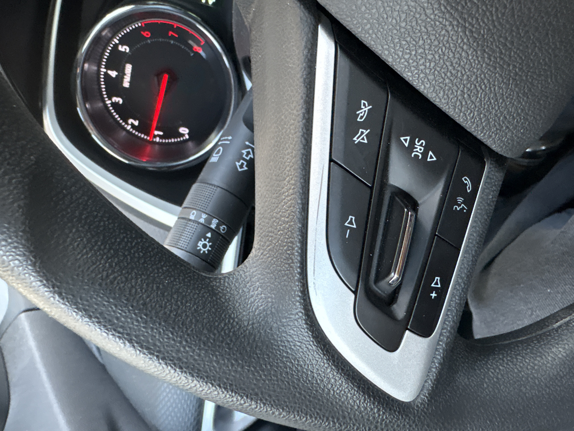 The image depicts the interior of a vehicle located in San Juan Cuautlancingo, Mexico. The primary focus is the black, textured steering wheel, shown from an oblique angle, obscuring the upper portion of the instrument cluster. On the left side of the steering wheel, a section of black plastic with a silver-colored trim houses a cluster of control buttons. These buttons include volume up/down, mute, phone call answer/hang-up, a horizontal rocker switch for navigation, and a "SRC" (Source) button with directional arrows. Behind the steering wheel, to the left, a black control stalk with white icons (light bulb, AUTO, turn signal arrows) is partially visible. To the right of the steering wheel and above the stalk, a circular tachometer gauge is visible within the instrument cluster. The tachometer indicates engine RPMs, with a red needle resting between 1 and 2, specifically at approximately 1200-1300 RPM, and redline markings from 6 to 8 (x1000 RPM). No individuals are visible in the scene. The ambient lighting suggests an interior setting during daylight hours.