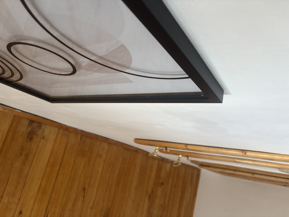 An upward-angled view captures an interior scene in the city of Antonovo, Bulgaria, depicting architectural elements and wall decor. The upper left portion of the image reveals a sloped ceiling constructed from horizontal light brown wooden planks exhibiting natural grain and some discoloration. Below the ceiling on the left, a light-colored wall features a segment of a wooden coat rack equipped with several brass-colored hooks. No items are suspended from the hooks. Dominating the right and central frame is a section of a white or off-white wall on which a rectangular framed piece of art is mounted. The art frame is dark, appearing black and matte, and slightly protrudes from the wall. The artwork within the frame displays an abstract design consisting of concentric and intersecting dark brown lines and circles, layered over soft, light brown or beige abstract shapes on a lighter background. Reflections are visible on the artwork's surface, indicating a glass or acrylic covering. No individuals or actions are present.