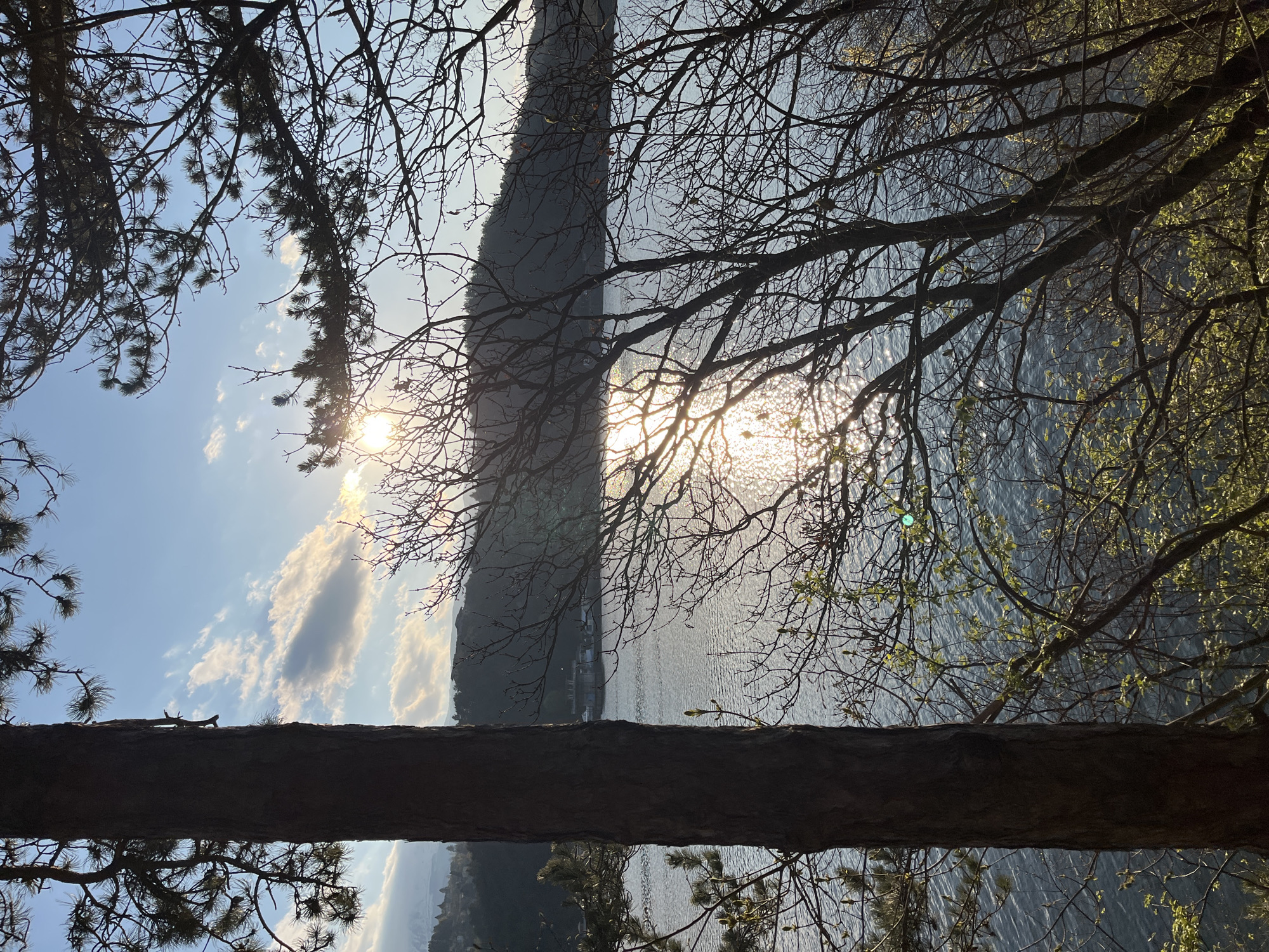 view of a lake framed by trees. The sun is reflecting off the water, creating bright glares. There is a silhouetted mountain or landmass in the distance. A prominent tree trunk is visible in the foreground. It is in Pancharevo, Bulgaria.