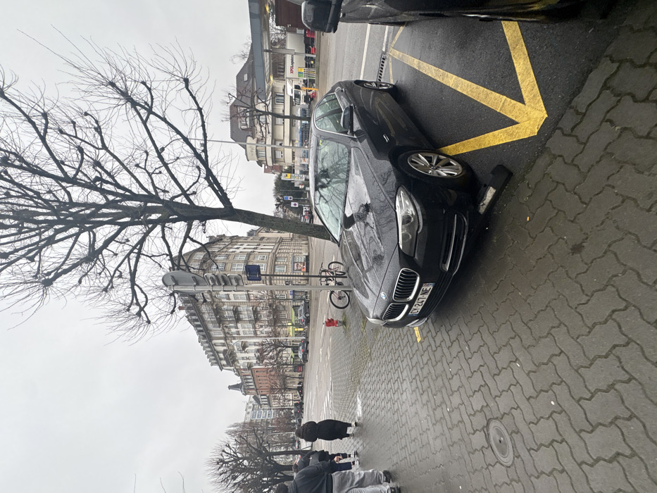 The image depicts an urban street scene at the intersection of Rue Monge and Avenue du Rhin in Strasbourg, France, under an overcast sky. A dark BMW sedan, bearing French license plate CY-247-NE, is parked diagonally on a wet asphalt surface, partially encroaching on yellow diagonal parking lines. A dark, elongated object rests on the pavement directly in front of the BMW's right front wheel. Water droplets are visible on the vehicle's hood and windshield. To the left of the BMW, a wet, grey interlocking paver sidewalk hosts several pedestrians, including three individuals in dark clothing walking away from the camera. A red fire hydrant and a black bicycle are positioned near a utility pole adjacent to a pedestrian crosswalk marked with white zebra stripes. A large, deciduous tree with bare branches stands prominently in the mid-ground, partially obscuring the background. In the background on the left, a multi-story, ornate building with numerous balconies and a distinctive roofline occupies the street corner, identified as 1 Rue Monge. Across the multi-lane roadway to the right, a gas station with a large canopy is visible, where several trucks, including one marked "XPO Logistics," are present. The overall scene is characterized by damp surfaces and bare trees, indicative of winter conditions.