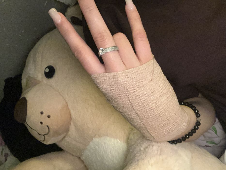 The scene, located in Entzheim, France, features a close-up view of a human hand resting on a plush, light-colored stuffed animal, identifiable as a teddy bear, which occupies the majority of the background. The hand is wrapped at the wrist and lower palm area with a beige elastic bandage. Below the bandage, a black beaded bracelet, featuring a single metallic spherical bead, is visible on the wrist. A silver-toned ring, set with a central clear, round gemstone and featuring a textured band, is worn on the ring finger. The hand's index and middle fingers are extended upwards, forming a 'V' gesture. The fingernails are long, square-tipped, and coated with a pale, neutral polish. The teddy bear displays a dark brown nose, stitched mouth details, and dark circular eyes. The immediate environment appears to be an indoor setting with soft fabric surfaces.